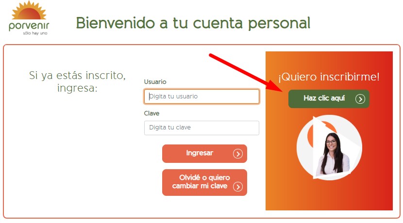 - Ingresar desde una computadora, laptop, tablet o teléfono inteligente a la sección de registro de la página web oficial del Porvenir y luego hacer click en el botón verde ubicado debajo de “¡Quiero inscribirme!”.