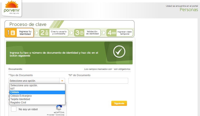 - Seleccionar en la pantalla siguiente un tipo de documento e ingresar el número correspondiente del afiliado a Porvenir. Después marcar con una tilde la casilla del Captcha No soy un robot y pulsar el botón de “Siguiente”.