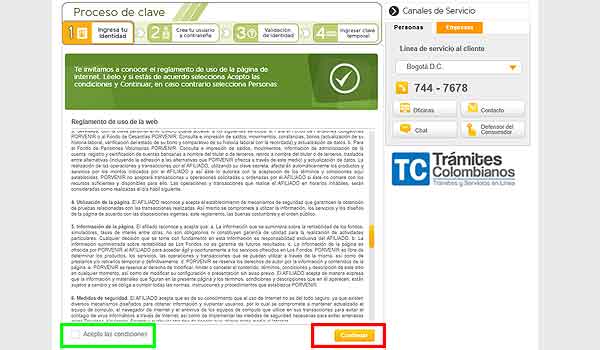 - Leer y aceptar todos los términos y condiciones que establece Porvenir para el uso de su plataforma en línea. Para hacerlo se debe marcar la casilla de “Acepto las condiciones”, ubicada en la parte inferior izquierda, y luego hacer clic en el botón “Siguiente” de la derecha.