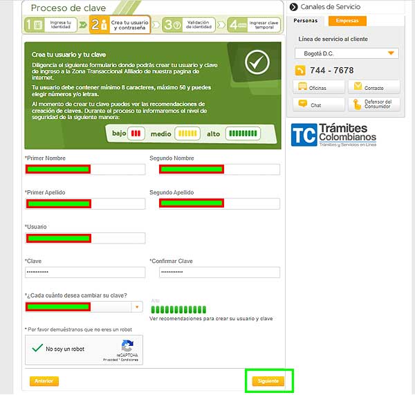 Para garantizar que el usuario pueda generar una clave segura, el sistema le asiste a través varios indicadores en el paso cuatro del procedimiento. La plataforma señala mediante los colores verde, amarillo y rojo si el nivel de robustez de la contraseña es bajo, mediano o alto, respectivamente.