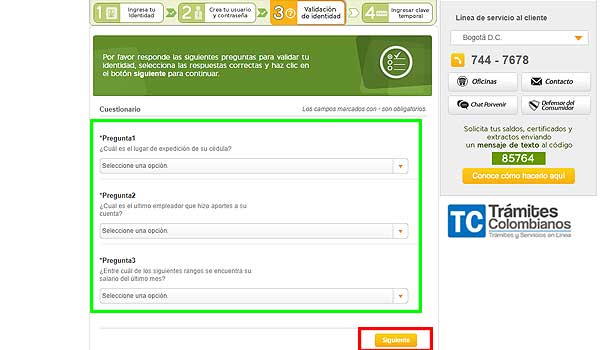 - Definir las tres preguntas de seguridad que solicita el sistema para corroborar la identidad de la persona. Todas ellas son de opción múltiple para facilitar el proceso a los usuarios. Una vez completadas, se tiene que cliquear sobre “Siguiente” para continuar.