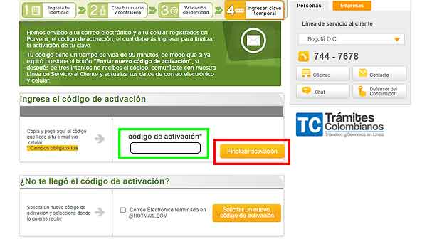 - Chequear el correo electrónico que envía el sistema de Porvenir e introducir el código de verificación otorgado y luego pulsar el botón “Finalizar Activación”, ubicado a la derecha del recuadro.