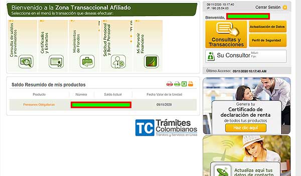 - Consultar la información deseada en este apartado del portal web de Porvenir, al cual se denomina zona transaccional de afiliado y que brinda acceso a la cuenta personal.